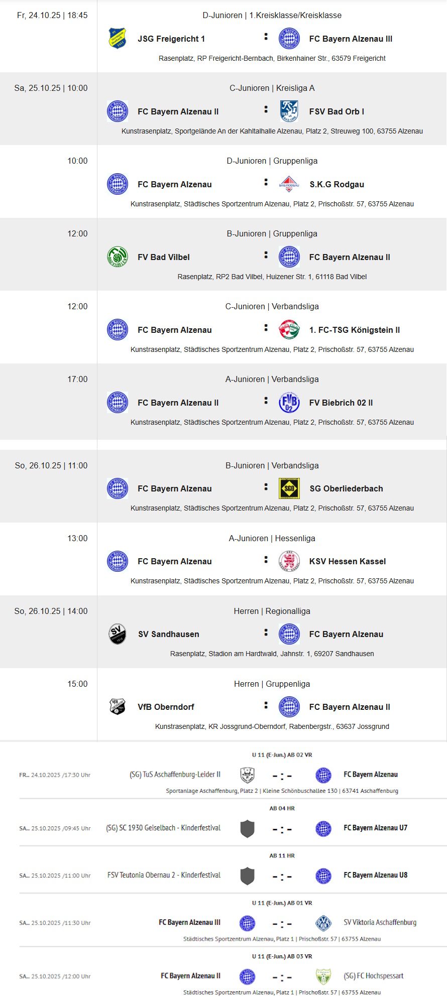 Am letzten Oktoberwochenende stehen einige Spiele beim FC Bayern Alzenau an. Aber nicht vergessen, zwischendurch die Uhren umzustellen!