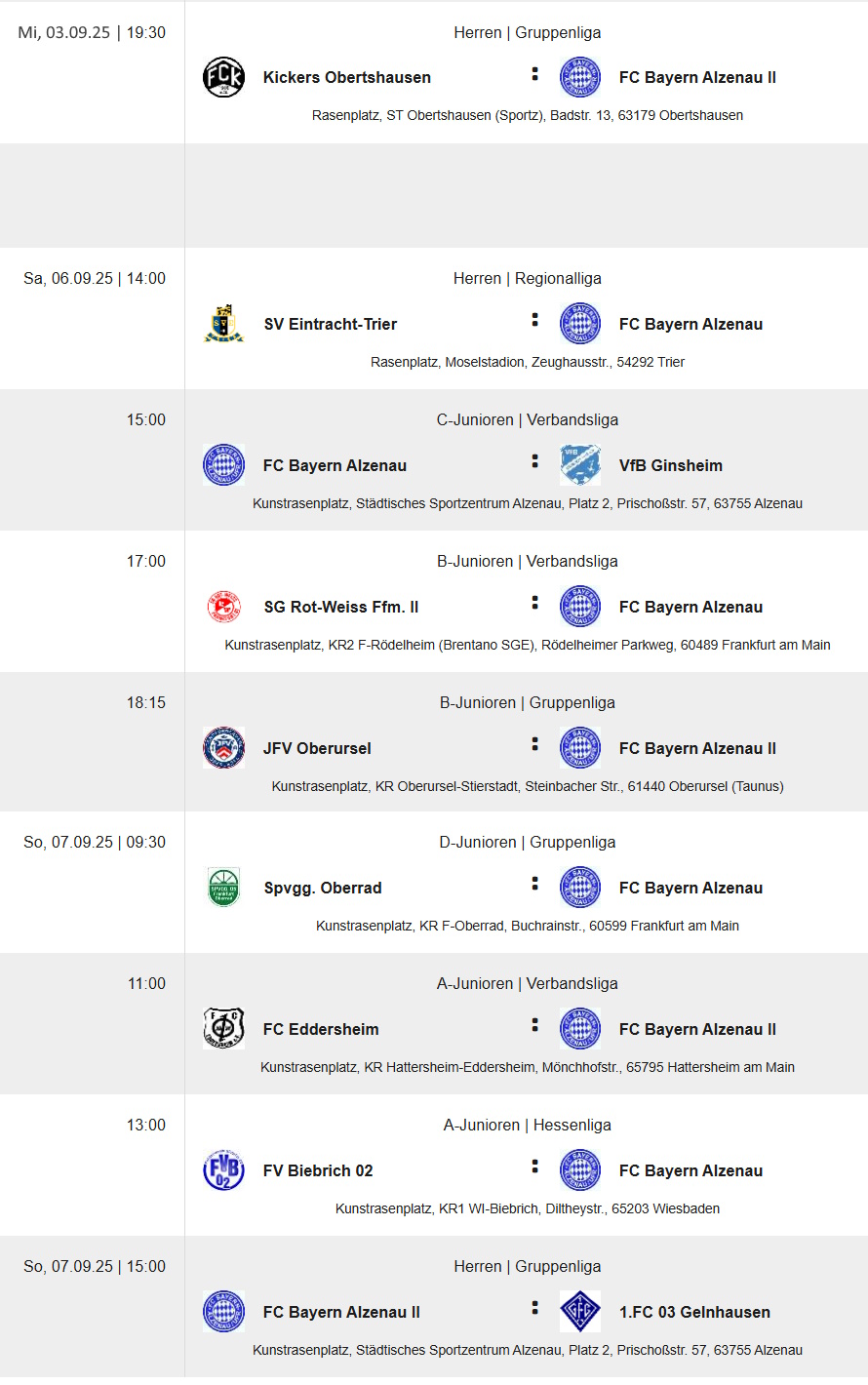 Das vergangene Wochenende war ein durchaus erfolgreiches für den FC Bayern Alzenau. Mit Spannung erwarten wir die kommenden Partien unserer Mannschaften in Weiß und Blau! Hier die Übersicht der anstehenden Meisterschaftsspiele: