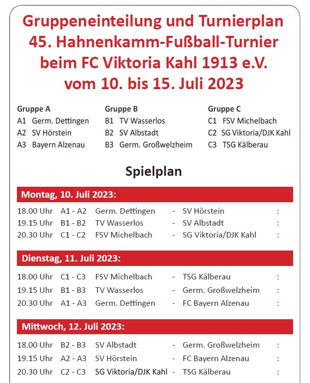 Am Montag startet auf dem Sportgelände von Viktoria Kahl das 45. Hahnenkammturnier. Als klassenhöchster Verein gehören wir neben dem TV Wasserlos, der SG Viktoria/DJK Kahl und Germania Dettingen automatisch zu den Turnierfavoriten. Aufgrund der Vorbereitung auf die in Kürze beginnende Hessenligapunktrunde muss Trainer Angelo Barletta zweigleisig fahren und neben den Spielen beim Hahnenkammturnier, Testspiele gegen höherklassige Gegner einbauen. Trotzdem ist es unser Ziel das Hahnenkammturnier zu gewinnen und zu den bisherigen 26 Turniersiegen am Samstag den 27. Pokalgewinn hinzuzufügen.