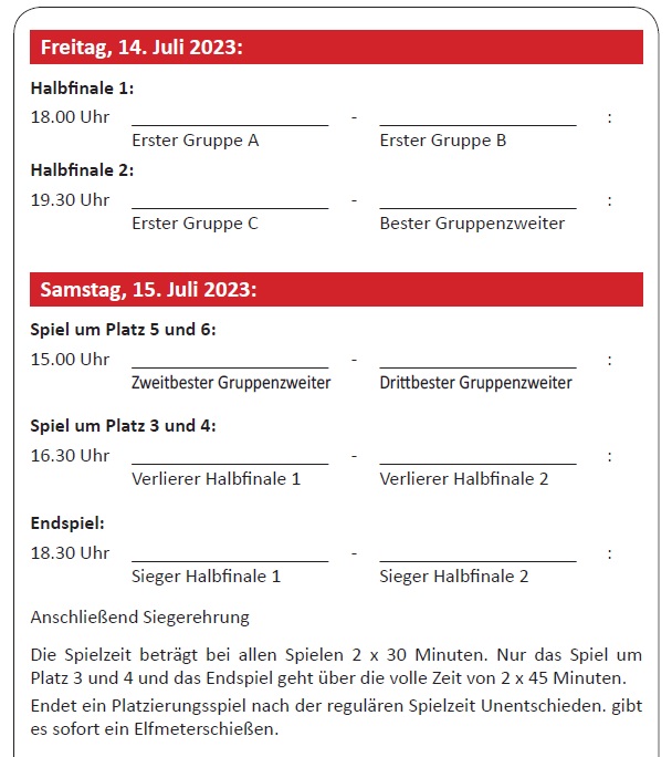Auch der TV Wasserlos schlachtet den SV Albstadt in einer Spielzeit von 2x30 Minuten mit 15:0 regelrecht ab. Gastgeber Viktoria Kahl hingegen tat sich mit einem 1:0 gegen Michelbach deutlich schwerer. Am heutigen Dienstag werden schon viele Vorentscheidungen bezüglich der Halbfinalbestzungen fallen.