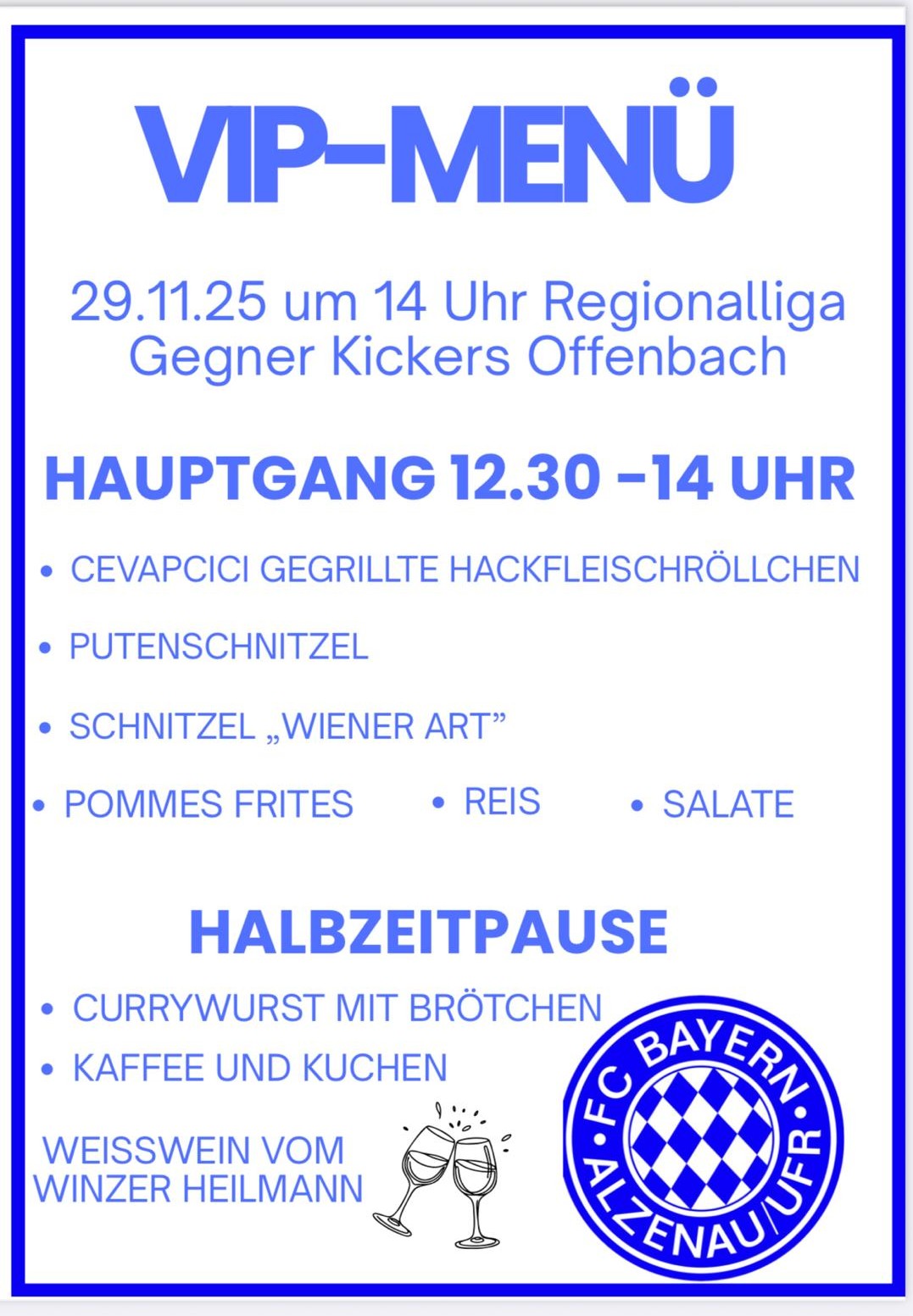 Die Speisekarte für die VIP-Gäste am Samstag gegen Kickers Offenbach. Karten zu einem Preis von 119 € (inkl. Mwst.) können über die Mail-Adresse: Diese E-Mail-Adresse ist vor Spambots geschützt! Zur Anzeige muss JavaScript eingeschaltet sein. erworben werden. Die VIP-Karte beinhaltet auch einen Parkplatz auf unserem separaten gekennzeichneten VIP-Parkplatz.