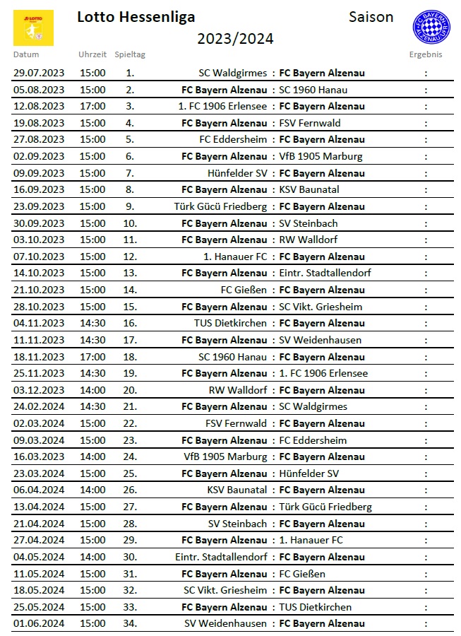 In die Saison starten wir am 29.07. mit einem Auswärtsspiel beim SC Waldgirmes. Zu unserem ersten Heimspiel empfangen wir am zweiten Spieltag zum Derby den starken Aufsteiger SC 1960 Hanau mit den vielen ehemaligen Alzenauer Spielern. Danach geht es zum nächsten "Hanauer" Derby nach Erlensee, bevor wir am vierten Spieltag den FSV Fernwald in der heimischen MAIREC Arena empfangen. Auf unsere Mannschaft wartet ein knackiges und attraktives Auftaktprogramm.