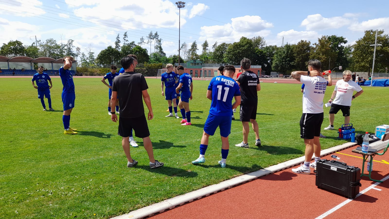 Alzenau presst früh. Bornheim kommt noch nicht über die Mittellinie. Ein erster Eckstoß der Bayern verpufft jedoch.