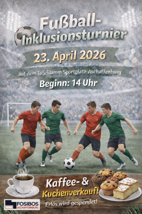 Am Donnerstag, den 23. April spielt unsere Mannschaft FC Bayern Alzenau III beim Fußball-Inklusionsturnier in Aschaffenburg. Wir freuen uns sehr über Eure Unterstützung!