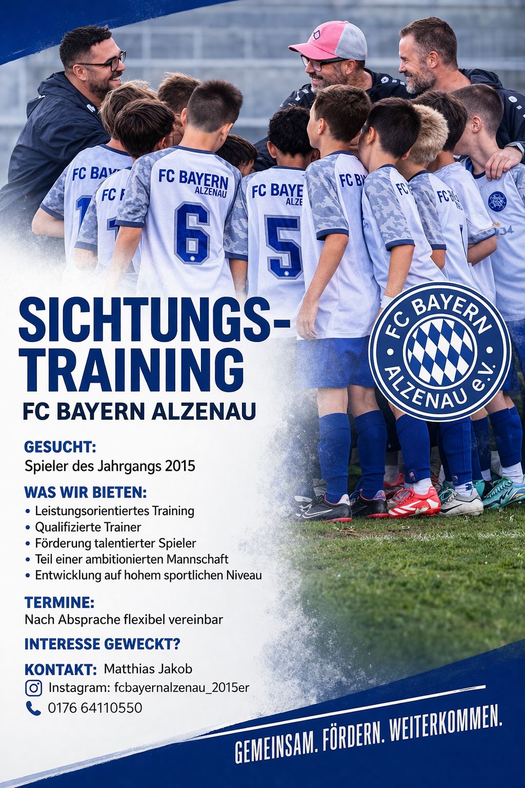 Der FC Bayern Alzenau bietet Euch (Jahrgang 2015) ein Sichtungstraining an. Meldet Euch unter der genannten Kontaktadresse und vereinbart ein individuelles Sichtungstraining! Wir freuen uns auf Euer Kommen!