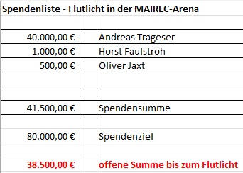 Unser Ziel sollte bis Ende März eine Spendensumme von 80.000 € sein. Dann würden wir den Bau der Flutlichtanlage in Auftrag geben.