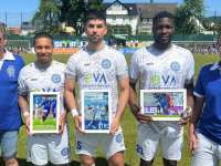 Vor dem letzten Heimspiel gegen Weidenhausen wurden mehrere Spieler verabschiedet. Von links: Vorstandsmitglied Thomas Schielein, Marcus Alexander, Philipp Topic, Luki Matondo und Vorsitzender Andreas Trageser. Leider schaffte die Mannschaft keinen versöhnlichen Punktspielabschluss in Form eines Sieges. Die Gäste feierten den Klassenerhalt euphorisch und unsere Spieler sind hoffentlich schon mit den Gedanken beim morgigen Pokalfinale gegen den FSV Bad Orb in Gelnhausen (Anpfiff 17 Uhr).